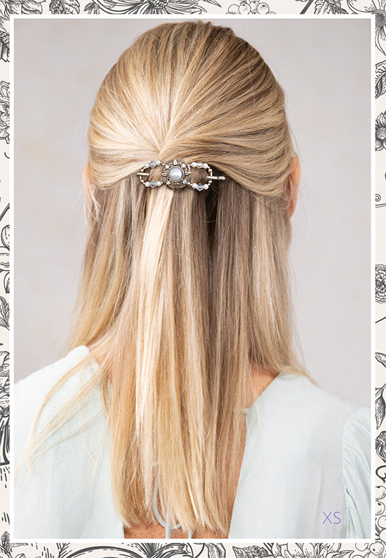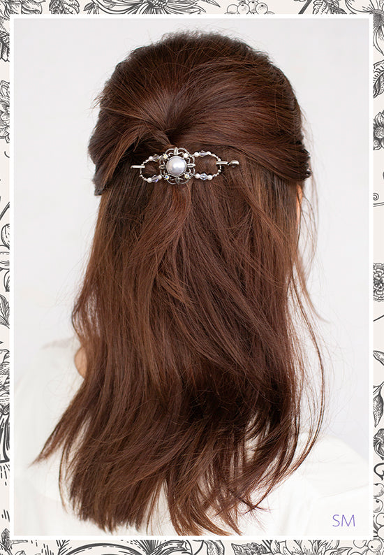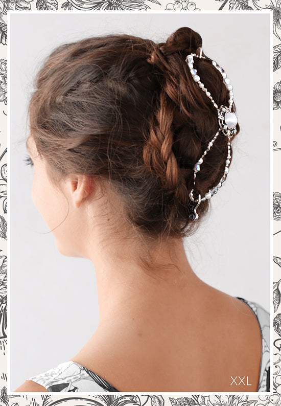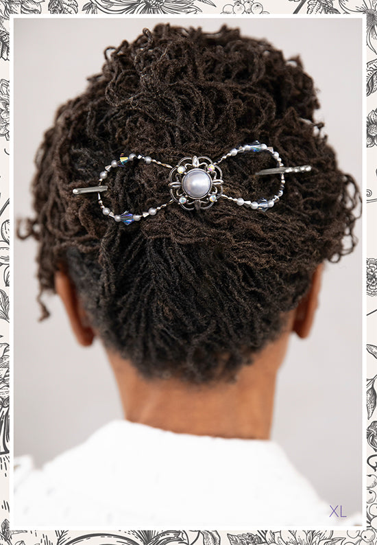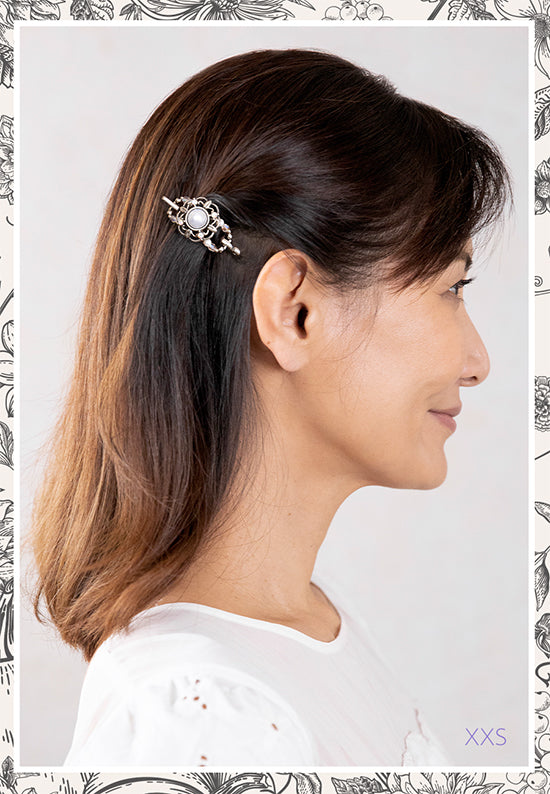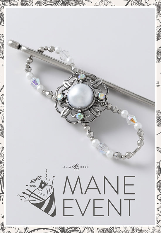 Intricately carved frame and luxurious pearl stoneset with pearl and crystal aurora borealis accents.
