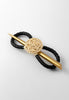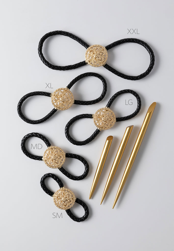 Intricately etched filigree with goldtone accents set on black braided leather. Includes coordinating metallic-gold coated wood Stick.