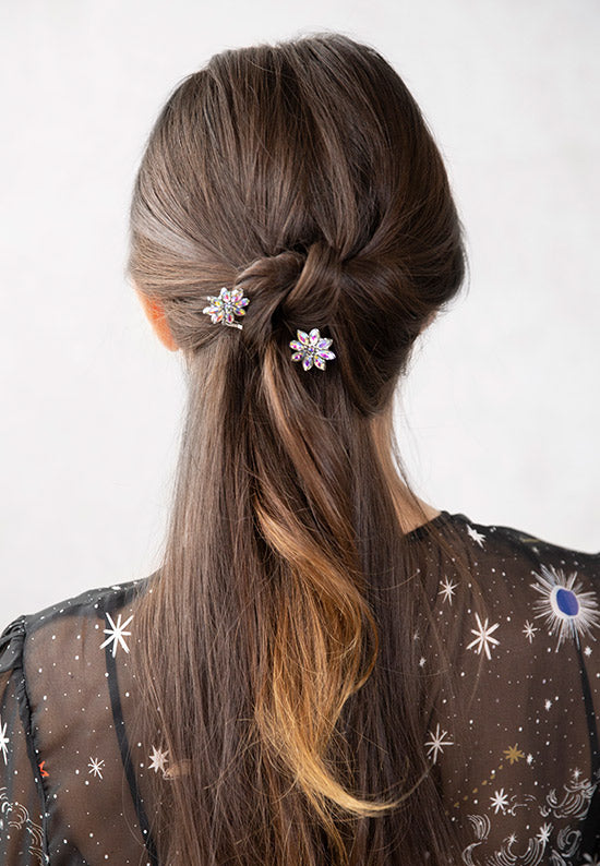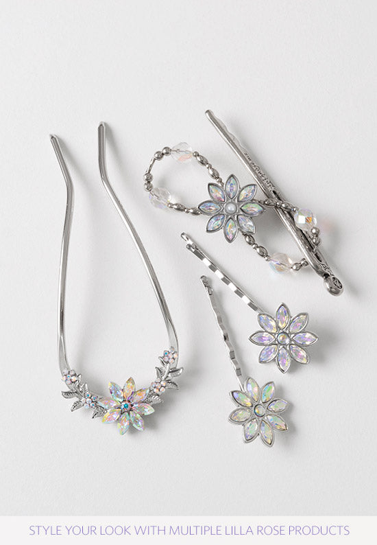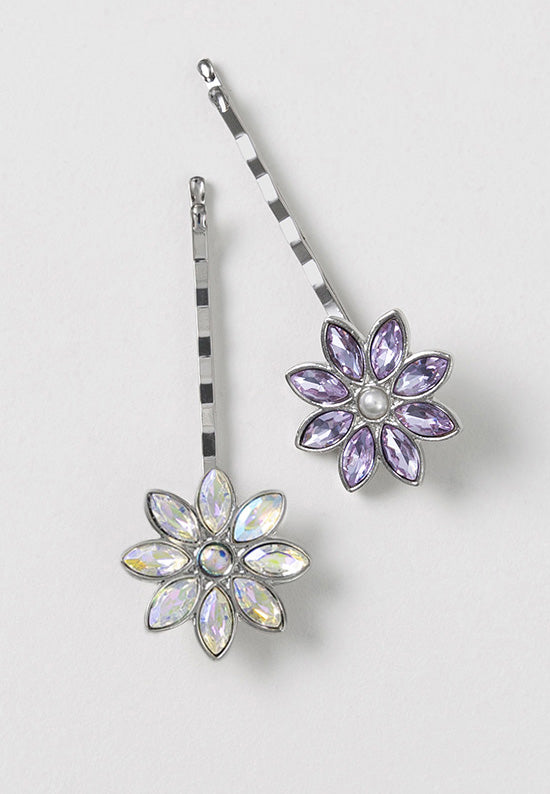 Flower shimmers and shines in crystal aurora borealis or purple tanzanite. Sold individually.