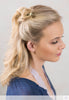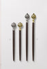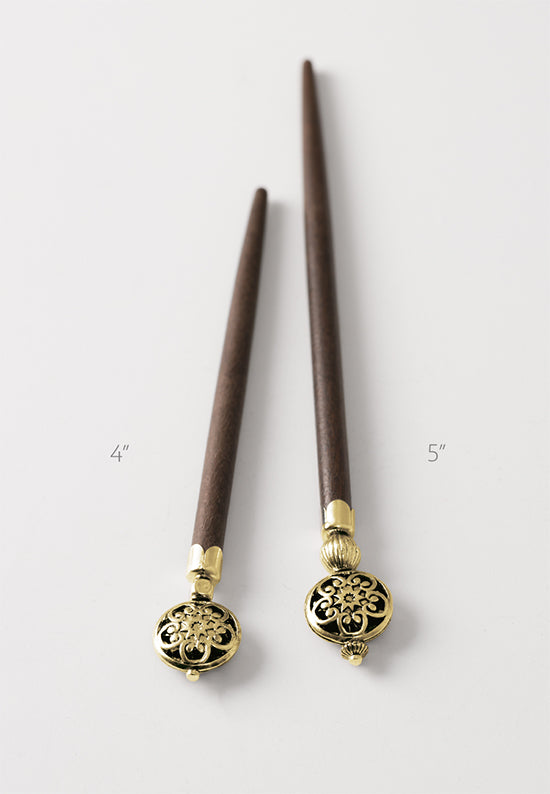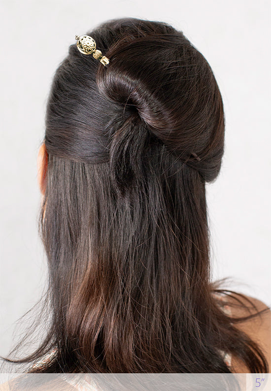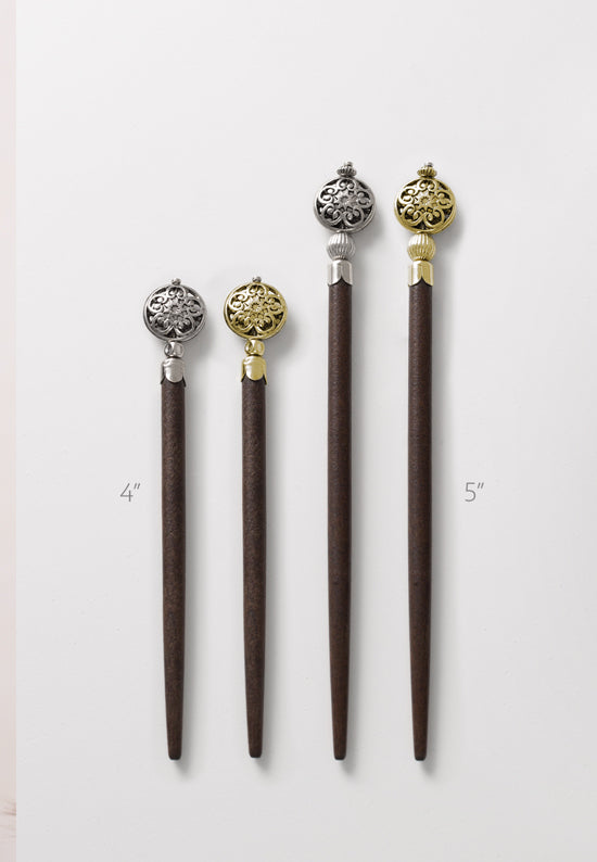 Cinque, a geometric flower antiqued available in silvertone or brasstone accents atop a tapered dark wood stick. Enjoy one or even two hair sticks with a lovely french twist or half up bun. Also makes a nice addition to the Leather 8 or Braided 8 Flexis.