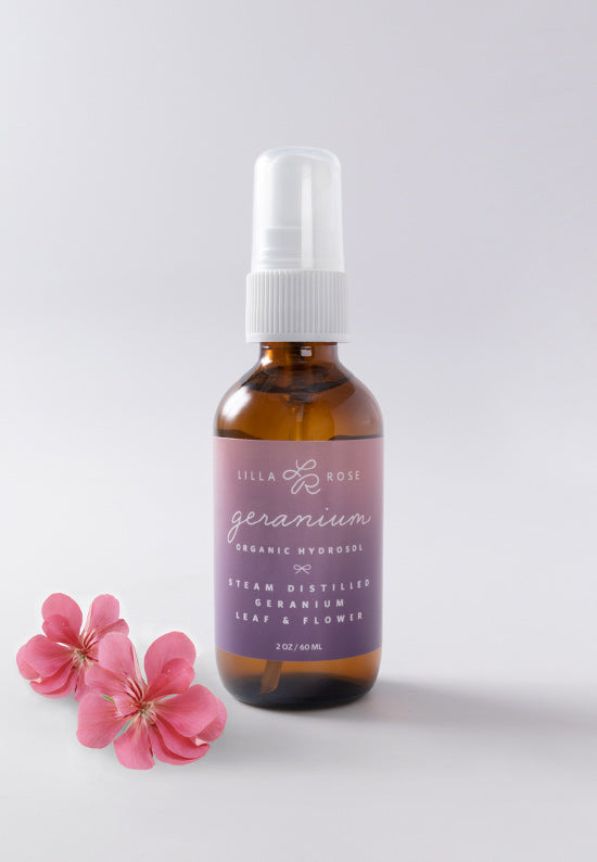 • Spray Geranium Hydrosol on your face for an energizing boost of hydration in the morning, or a relaxing mist before bed