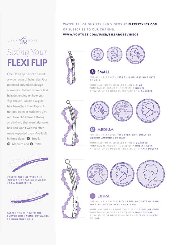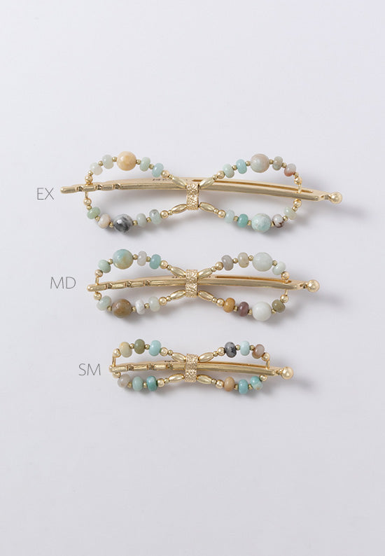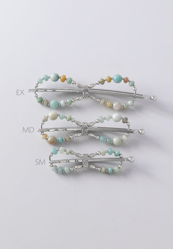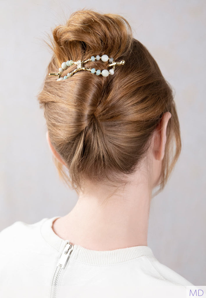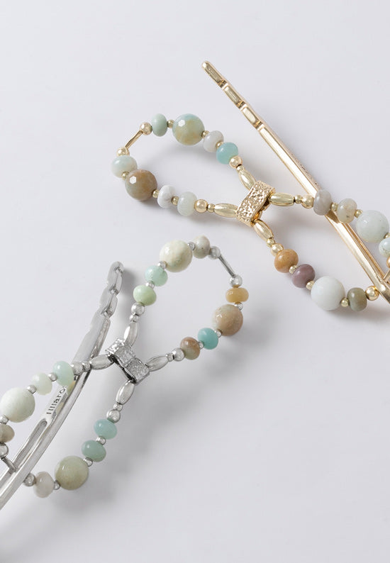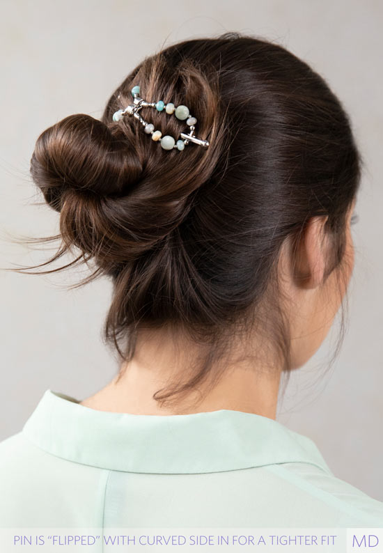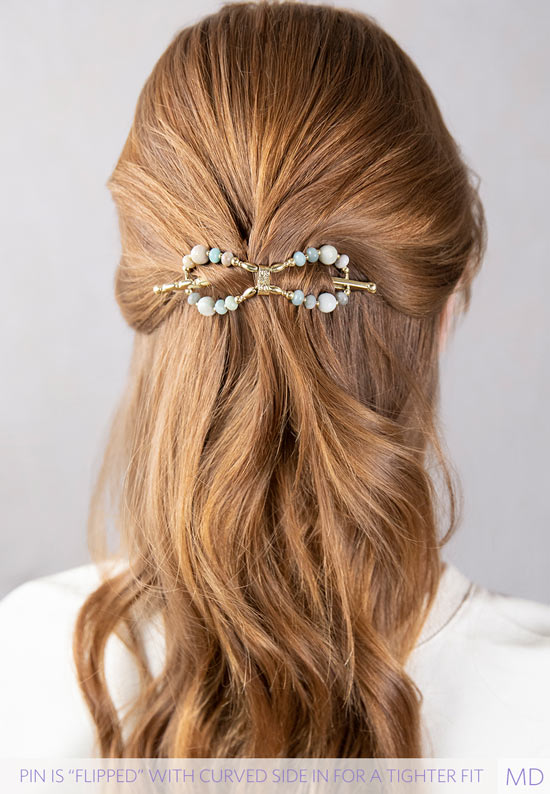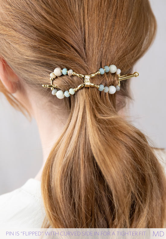 Unique curved pin design provides up to three different sizes by creating a tighter fit when flipped, which allows for multiple hairstyles with just one Flexi Flip! This elegant design is made with natural amazonite and named after one of our top Flexi Reps, Kellie A.