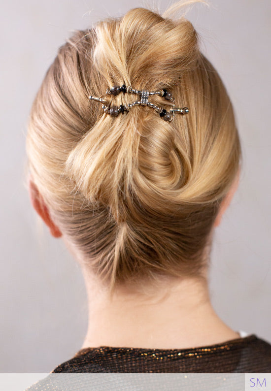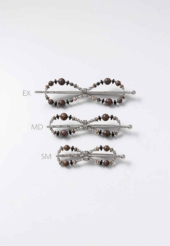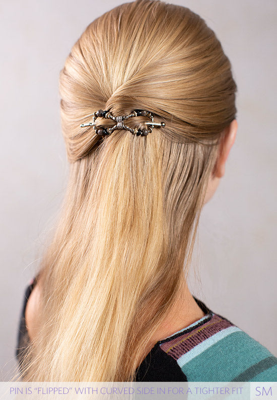 Unique curved pin design provides up to three different sizes by creating a tighter fit when flipped, which allows for multiple hairstyles with just one Flexi Flip! This earthy design is made with brown Jasper and named after one of our Flexi Reps, Kristen S.