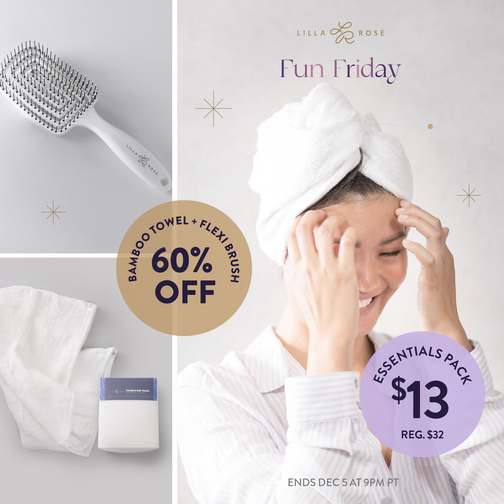 Fun Friday price of only $13! That's 60% off the original price of $32! Our most popular Flexi Hair Brush with our soft, luxurious Bamboo Hair Towel - the perfect Essential pack for yourself or gift giving. No substitutions, replacements, exchanges, refunds or backorders; while supplies last. All sales final.