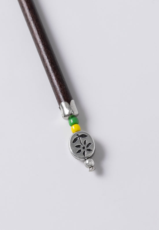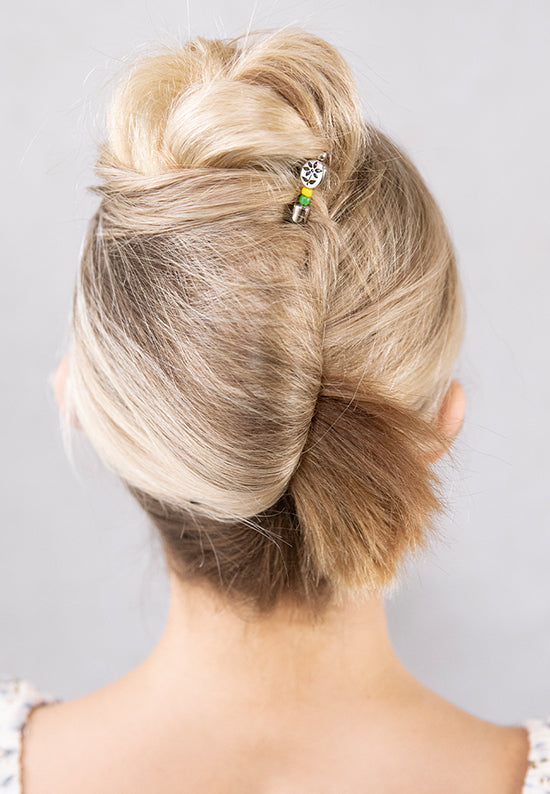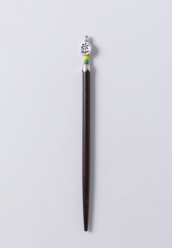 Oval button embossed with a flower, with green and yellow bead accents. Available for a Limited Time Only or while supplies last.