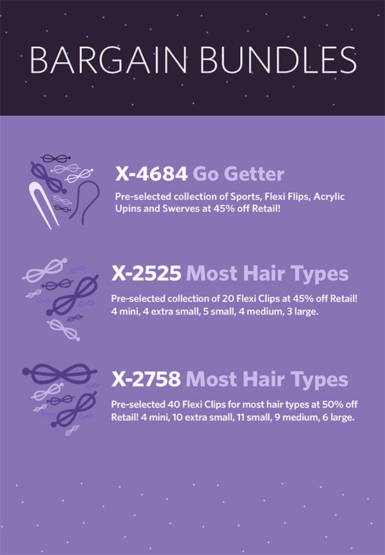 • X-2758: Pre-selected collection of 40 Flexi Clips for most hair types at 50% off Retail! Original retail value $615. 4 mini, 10 extra small, 11 small, 9 medium, 6 large.