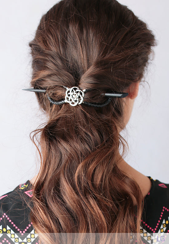 Genuine leather braided and shaped into the flagship Flexi Clip in three different designs. Each Braided 8 comes with a coordinating hair stick. Many other hair sticks styles are sold separately for a customized option.