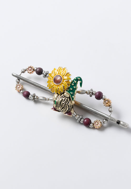 Cheery gnome wears a bright yellow hat and holds onto a sunflower. Available for a Limited Time or while supplies last.