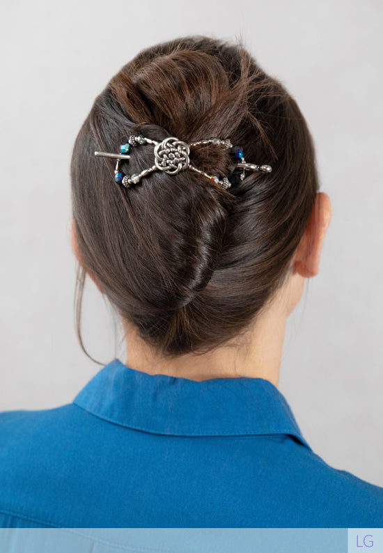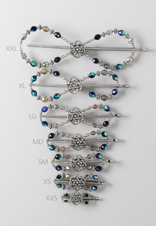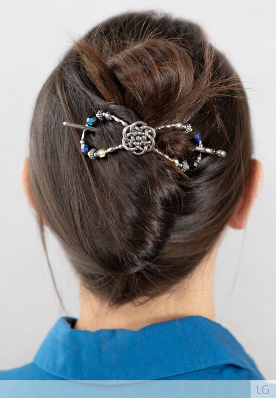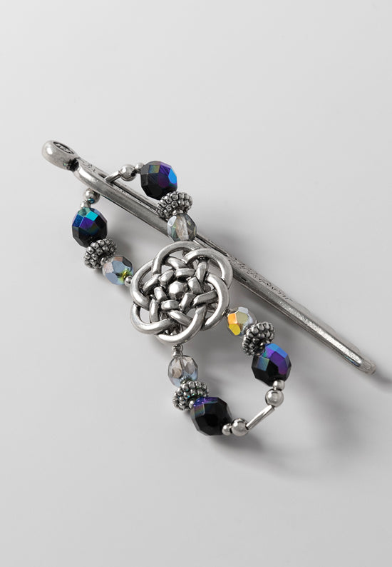 Celtic knot with jet black aurora borealis and maria glass bead accents. Available for a Limited Time Only or while supplies last.