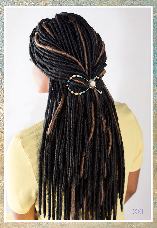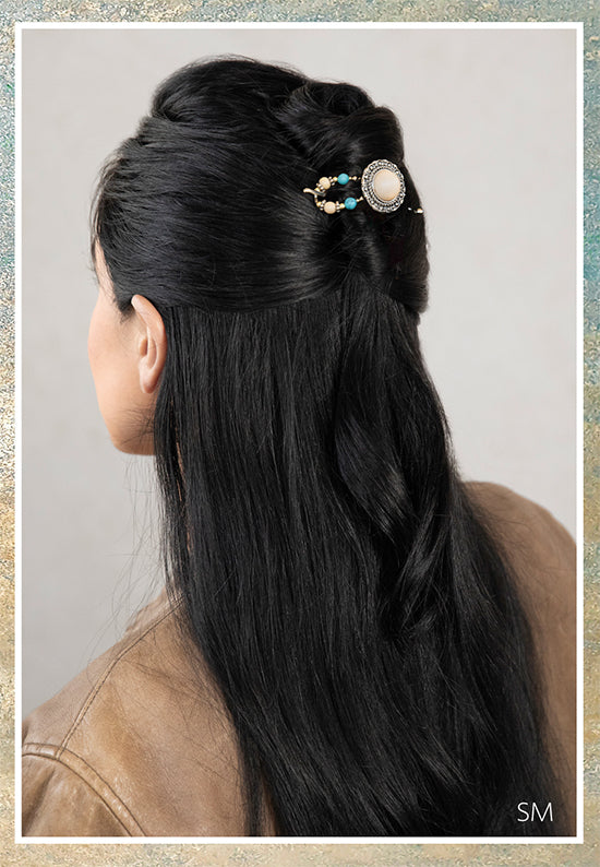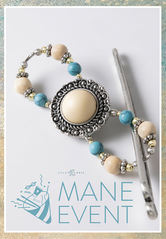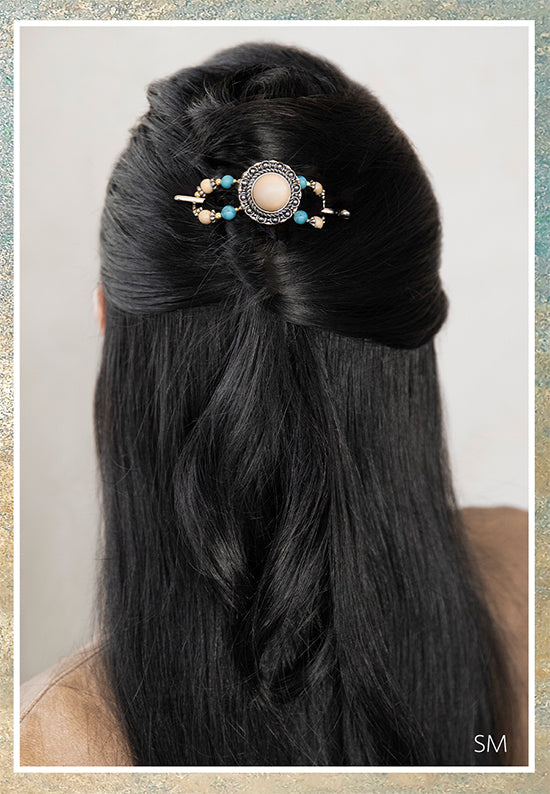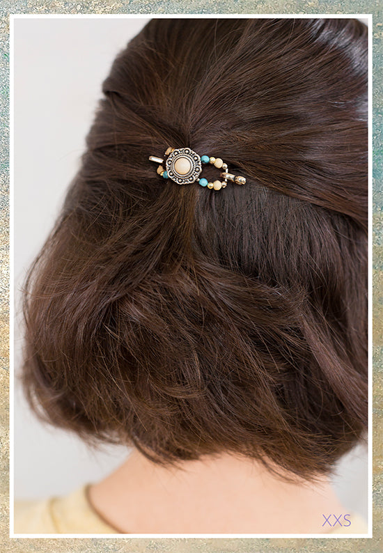 Intricately carved frame with stoneset combined with lite earthy wood, turquoise and set in silvertone and brasstone accents.
