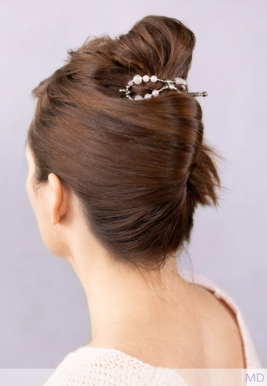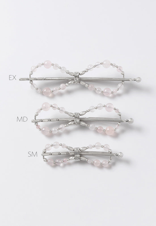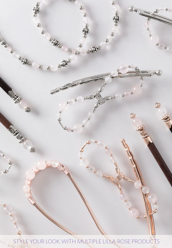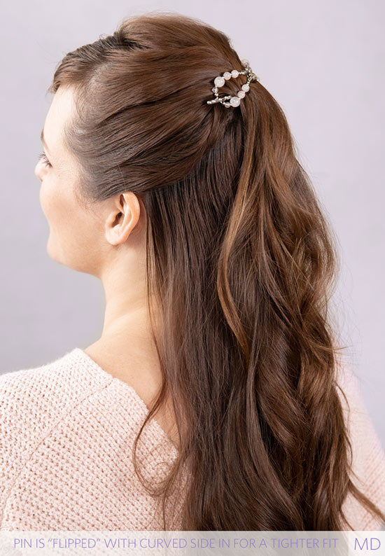 Unique curved pin design provides up to three different sizes by creating a tighter fit when flipped, which allows for multiple hairstyles with just one Flexi Flip! This elegant design is made with natural rose quartz and named after one Flexi Reps, Pamela M.